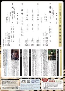 | 演目/シテ | 能『清経』狩野了一 仕舞『笹之段』菊本美貴(観世流) 仕舞『網之段』松井笙子(金春流) 仕舞『玉之段』大島衣恵 狂言『棒縛』野村万禄 半能 『天鼓 弄鼓之舞』菊本澄代(観世流) |