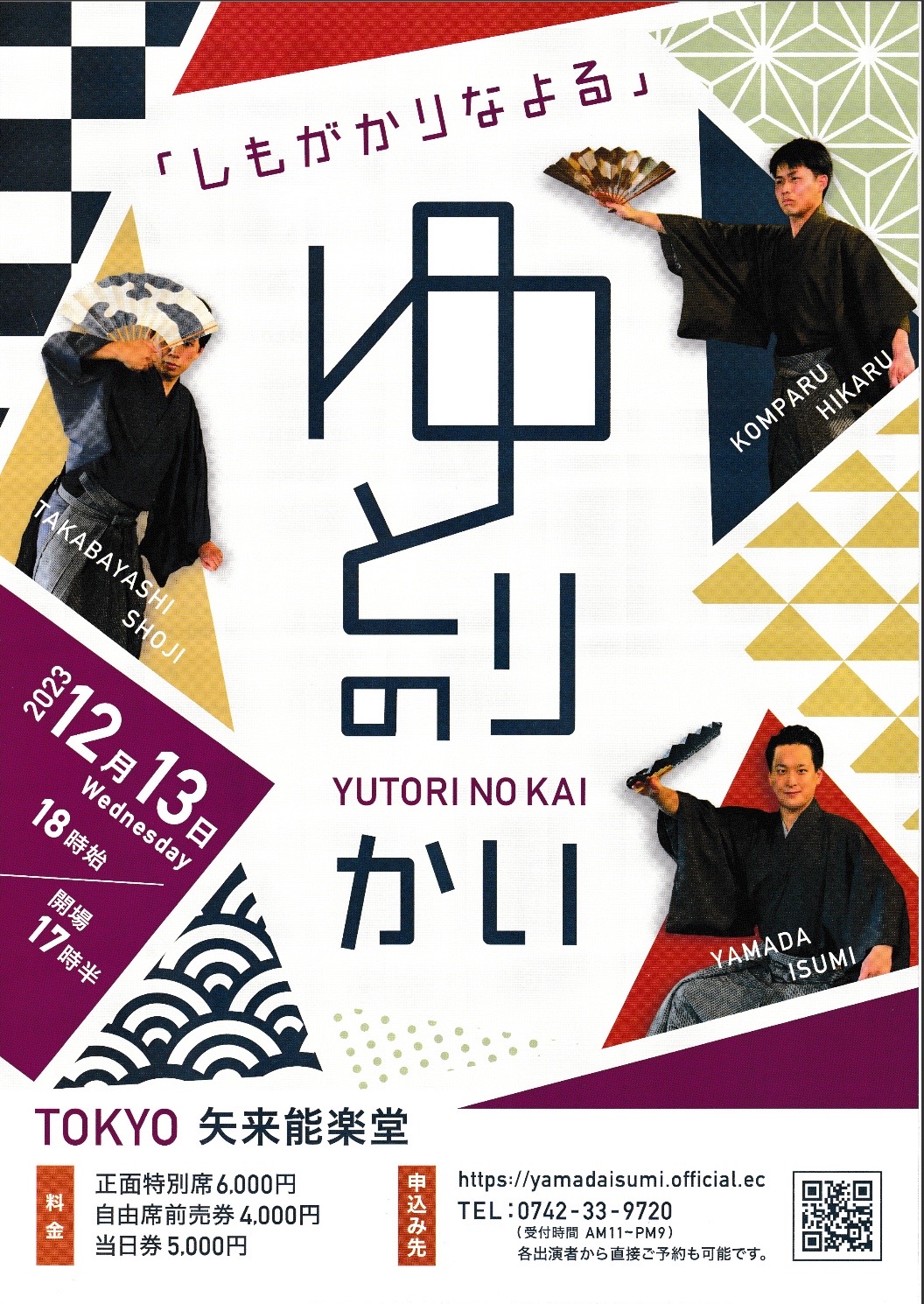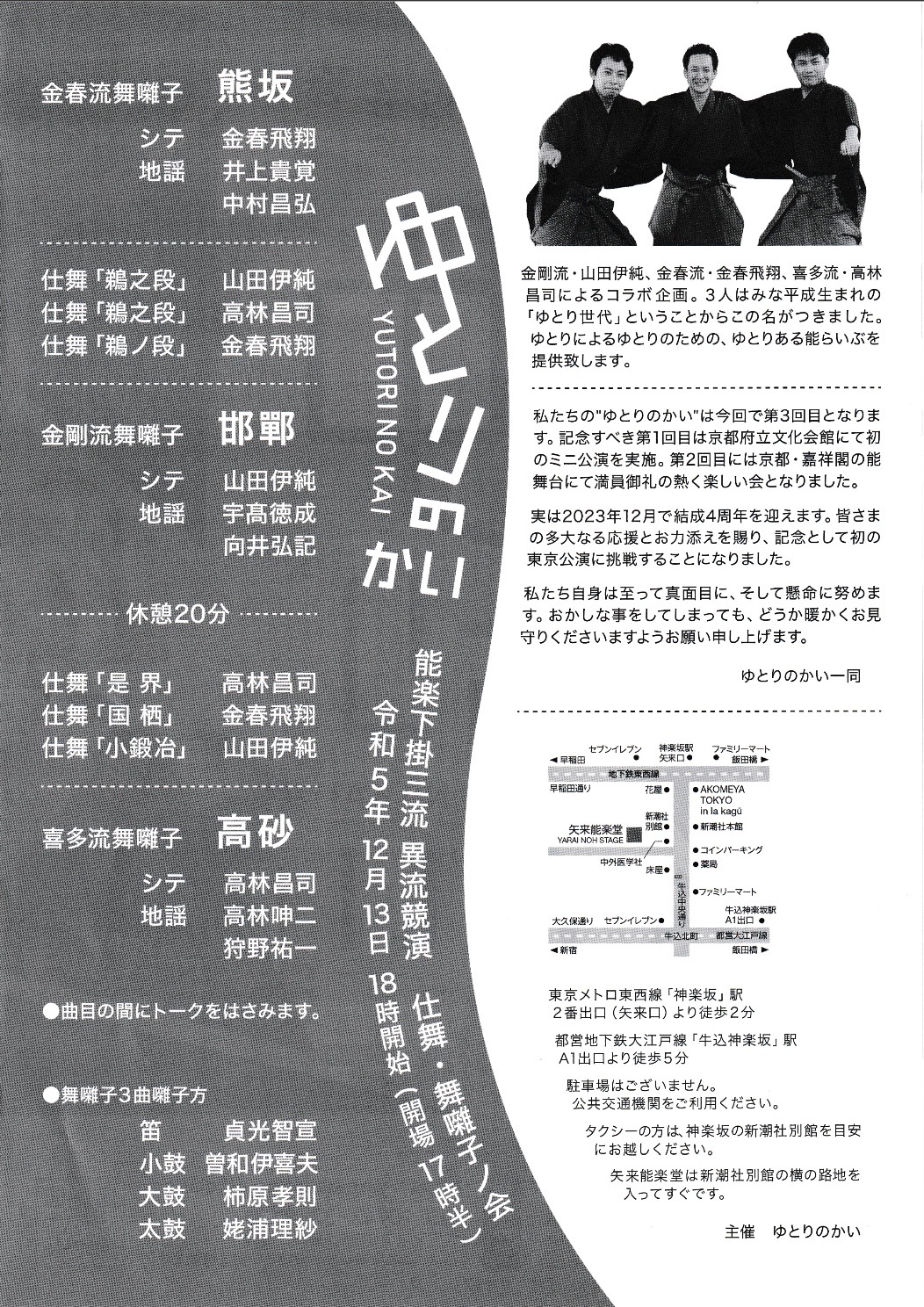 | 演目/シテ | 金春流舞囃子『熊坂』金春飛翔 金剛流舞囃子『邯鄲』山田伊純 喜多流舞囃子『高砂』高林昌司 ほか |