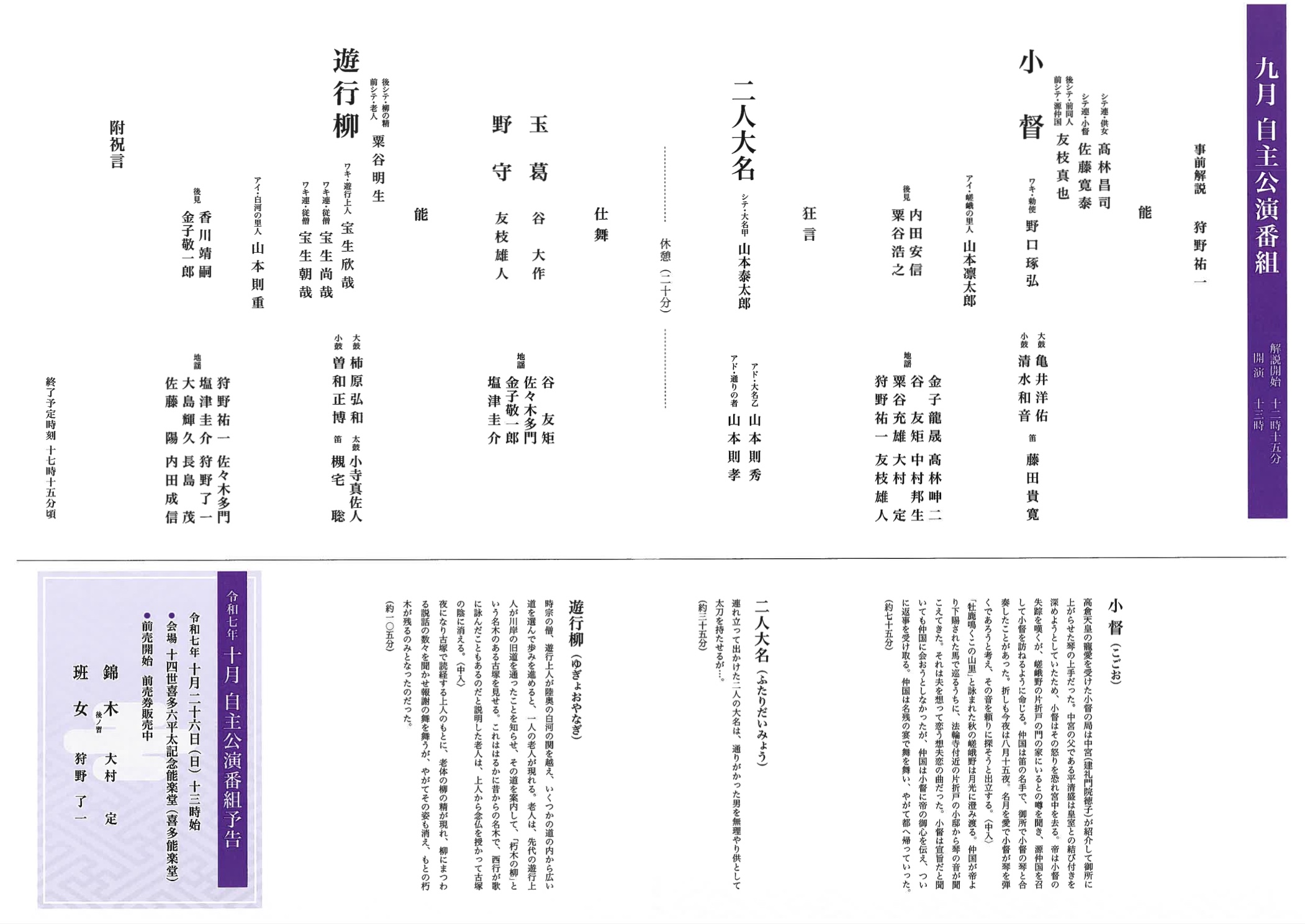 ※開演前12時15分より本舞台にて喜多流能楽師による演目解説がございます(9月担当 狩野祐一)