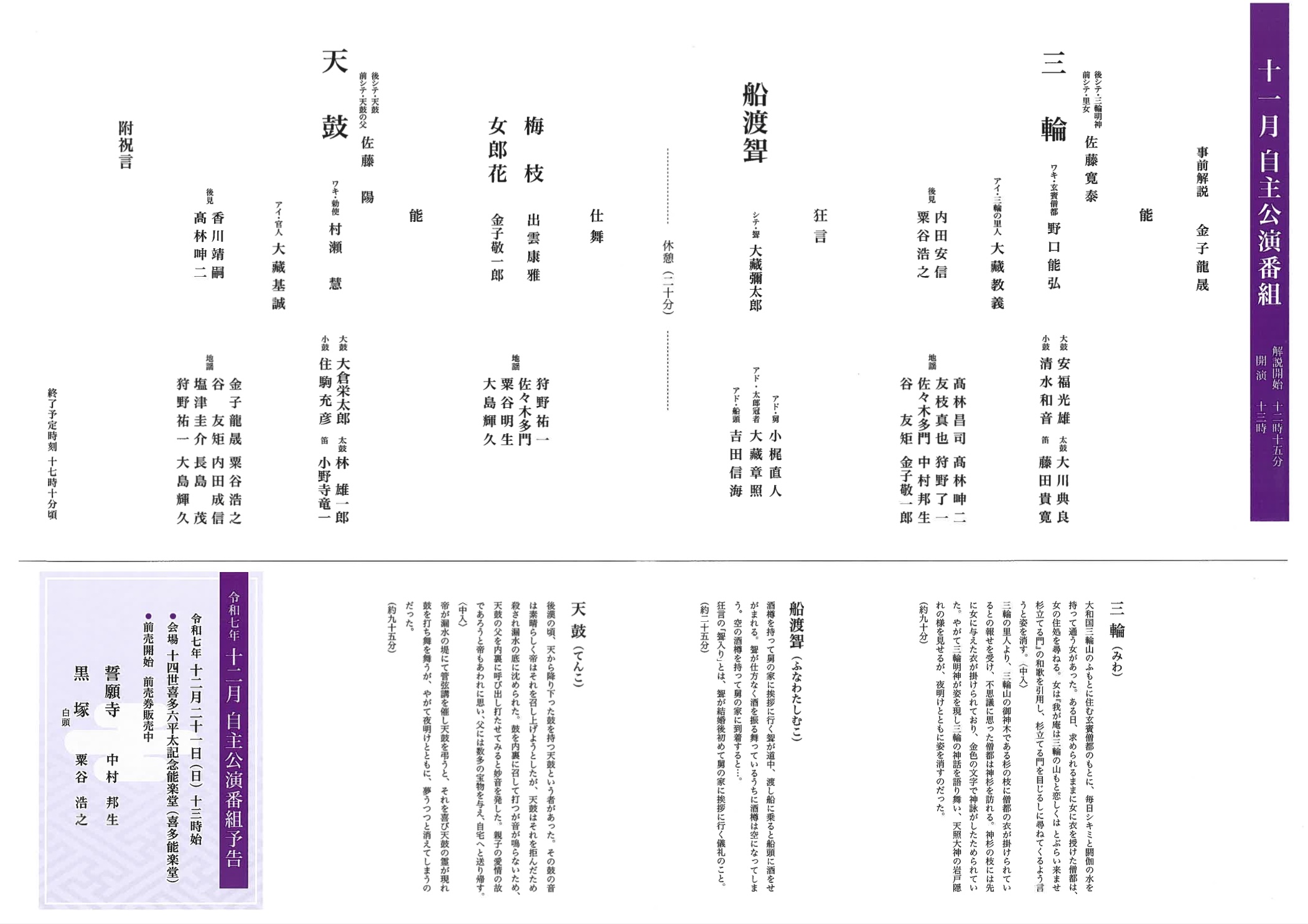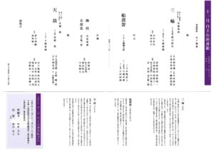 | 演目/シテ | 能『三輪』佐藤寛泰 狂言『船渡聟』大藏彌太郎 仕舞『梅枝』出雲康雅 仕舞『女郎花』金子敬一郎 能『天鼓』佐藤 陽 |