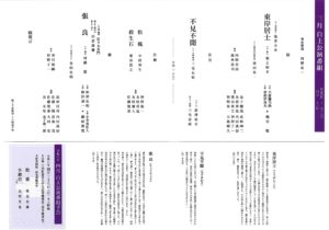 | 演目/シテ | 能『東岸居士』塩津圭介 狂言『不見不聞』三宅右矩 仕舞『松風』中村邦生 仕舞『殺生石』粟谷浩之 能『張良』出雲康雅 |