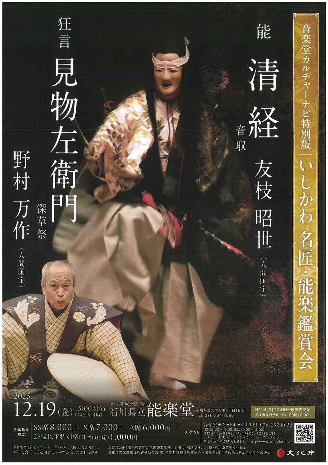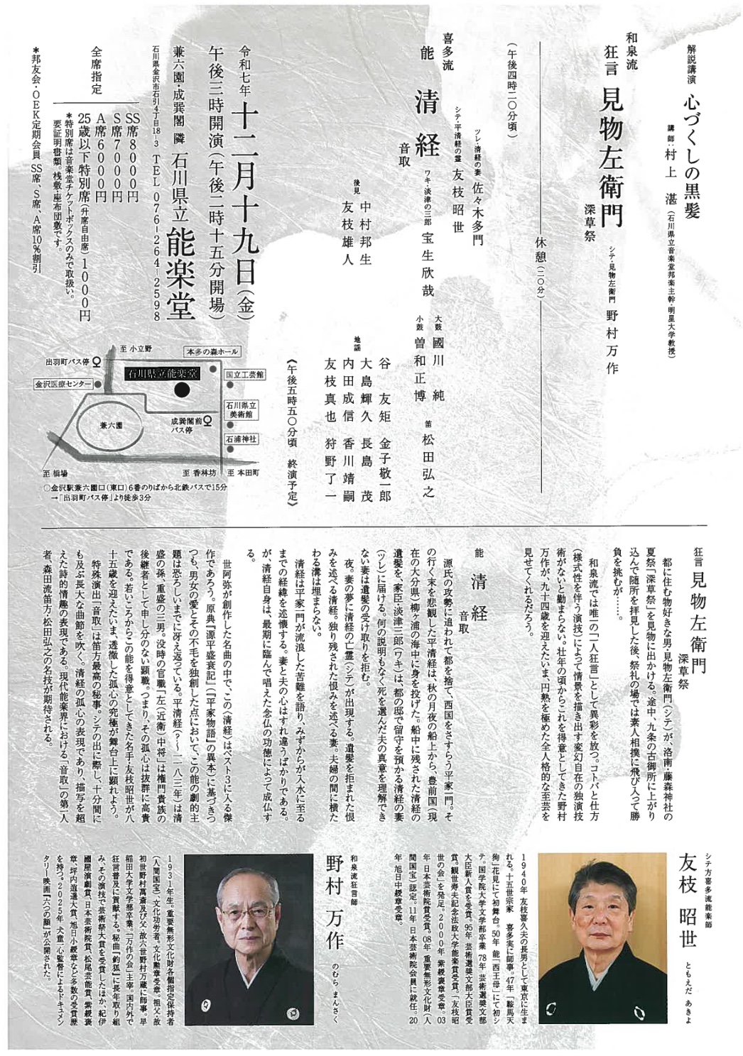 | 演目/シテ | 解説講演『心づくしの黒髪』村上 湛 狂言『見物左衛門 深草祭』野村万作 能『清経 音取』友枝昭世 |