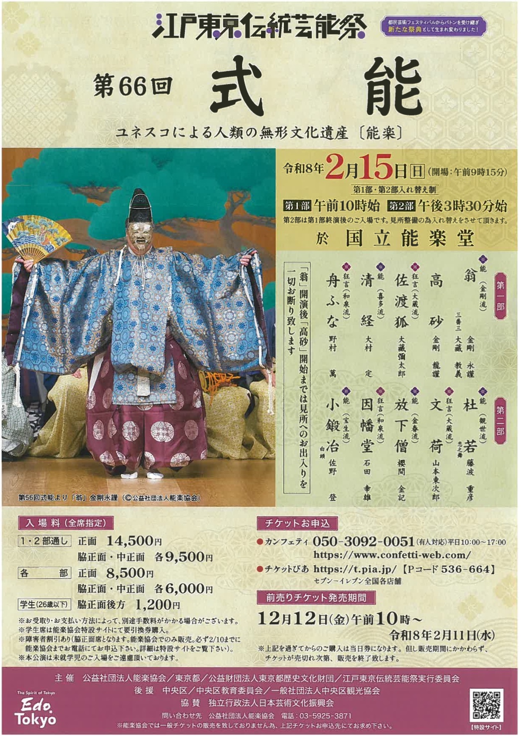 | 料 金 | <1・2部通し> 正面 14,500円 脇・中正面 9,500円 <各部> 正面 8,500円 脇・中正面 6,000円 <学生> 脇正面後方 1,200円 |