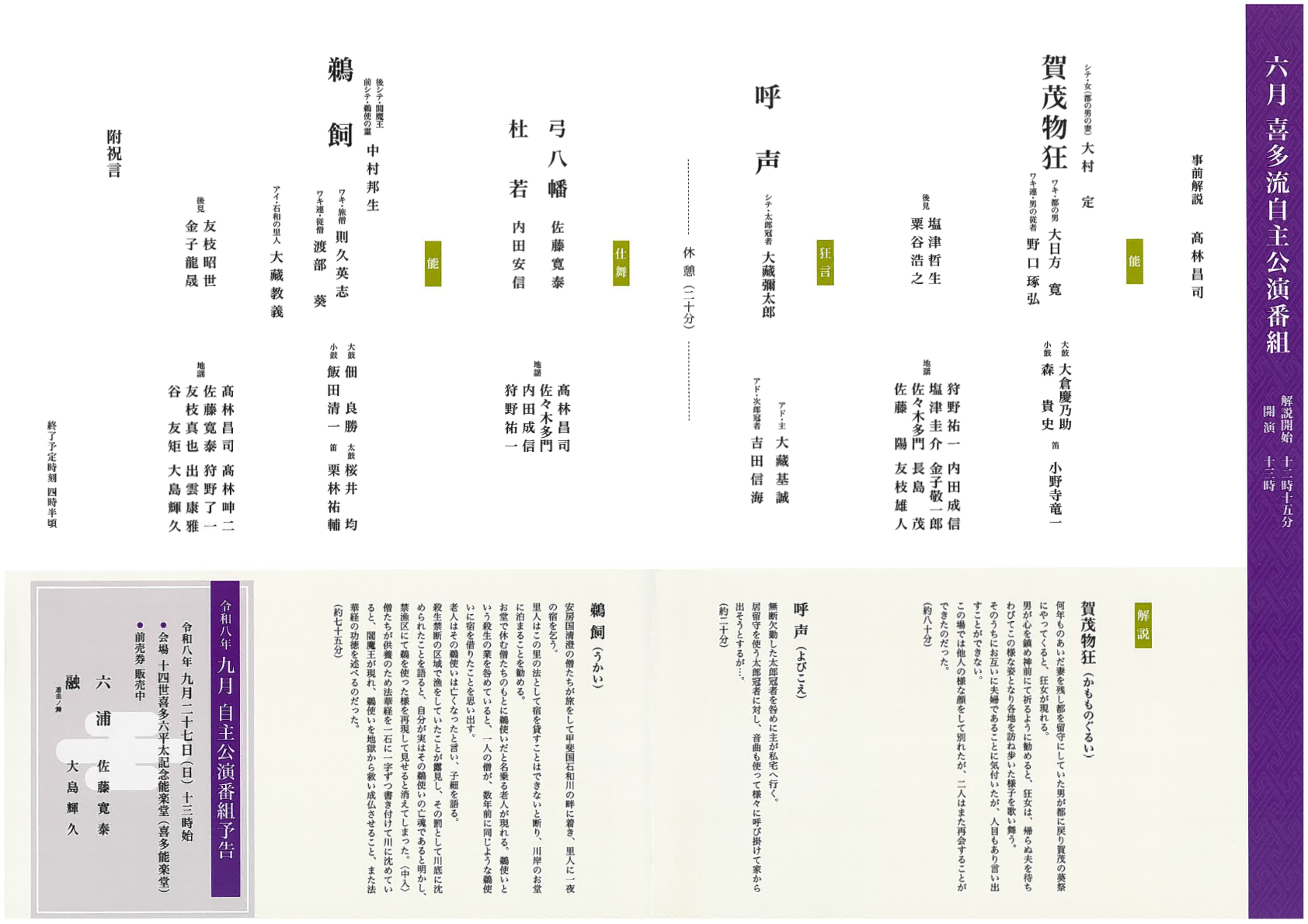 | 演目/シテ | 能『賀茂物狂』大村 定 狂言『呼声』大藏彌太郎 仕舞『弓八幡』佐藤寛泰 仕舞『杜若』内田安信<br> 能『鵜飼』中村邦生 |