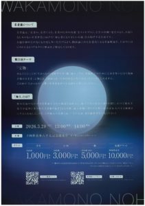 | お問い合わせ | 若者能実行委員会 wakamononoh.official@gmail.com チケットはこちら https://21stwakamononoh.peatix.com |