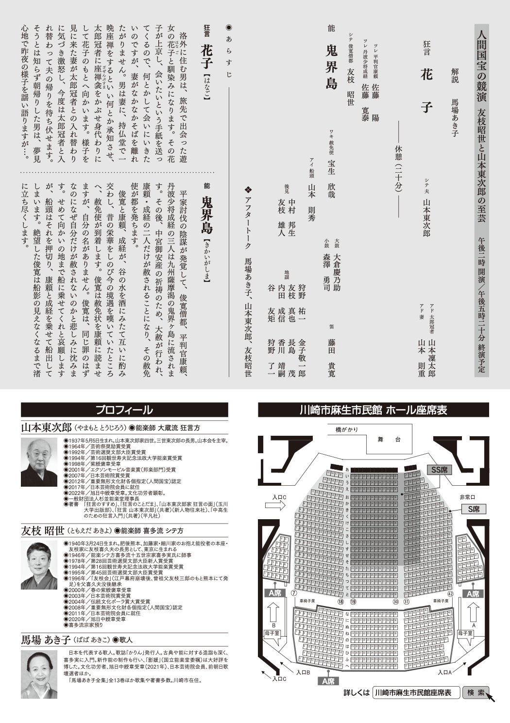 | 演目/シテ | 解説 馬場あき子 狂言『花子』山本東次郎 能『鬼界島』友枝昭世 アフタートーク 馬場あき子、山本東次郎、友枝昭世 |