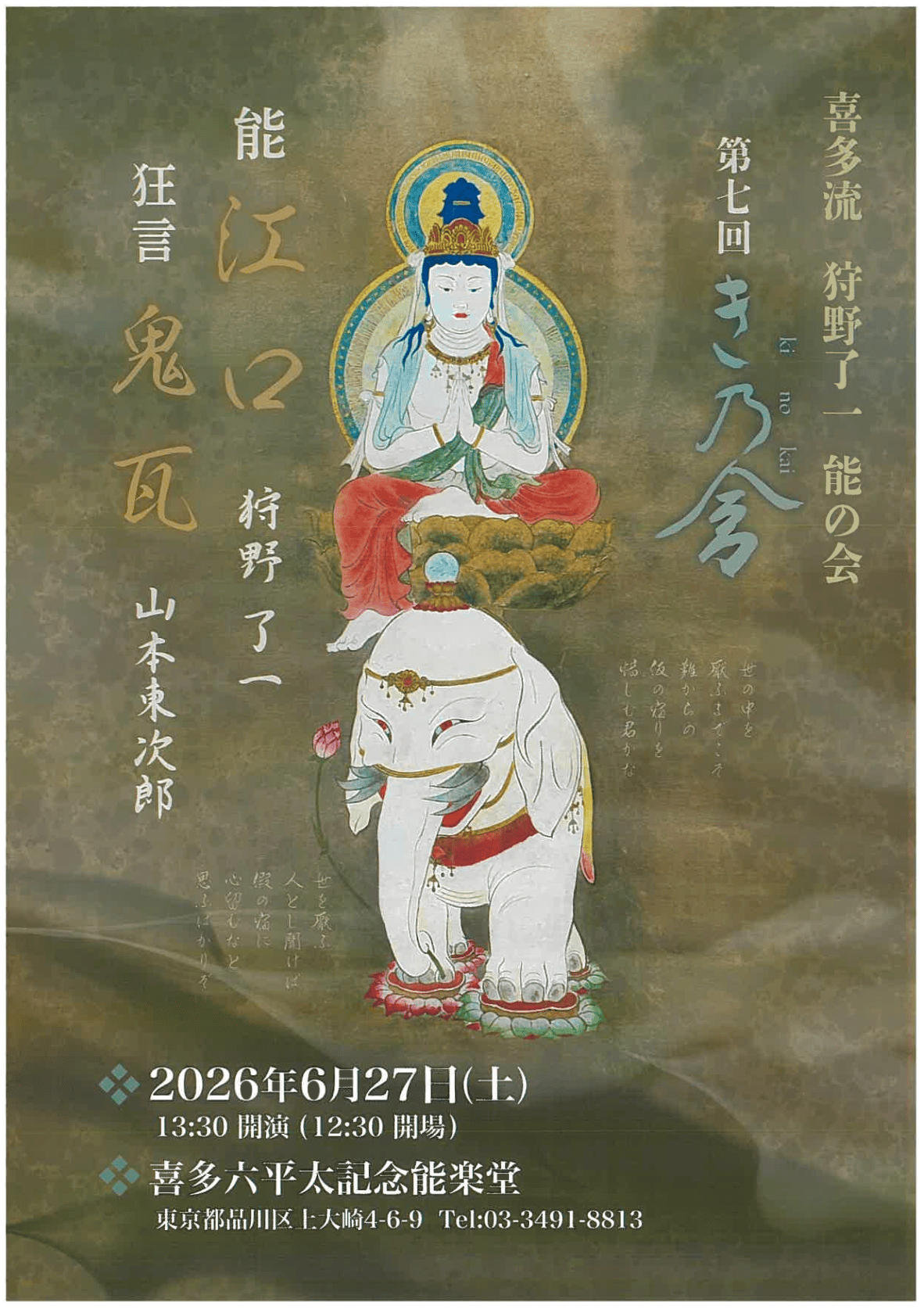 | 演目/シテ | おはなし 山中玲子 狂言『鬼瓦』山本東次郎 能『江口』狩野了一 |