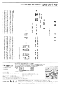 | 演目/シテ | 解説 金子敬一郎 能『綾鼓』友枝昭世 |