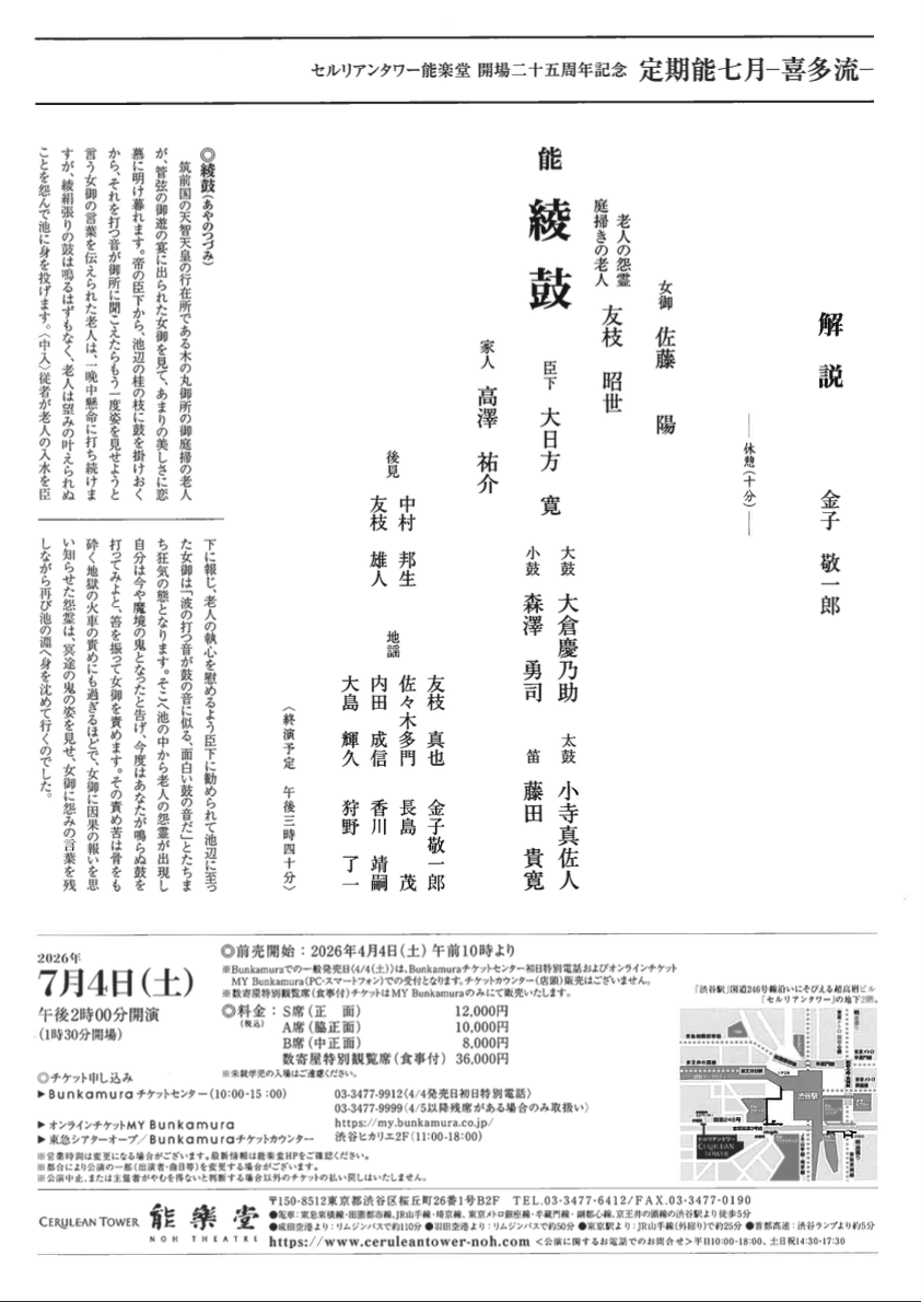 | お問い合わせ | Bunkamuraチケットセンター ☎︎03-3477-9912(4/4 発売初日特別電話)03-3477-9999(4/5以降残席がある場合) オンラインチケットMy Bunkamura https://my.bunkamura.co.jp/ セルリアンタワー能楽堂 ☎︎03-3477-6412(平日 10:00-18:00・土日祝 14:30-1730) |
